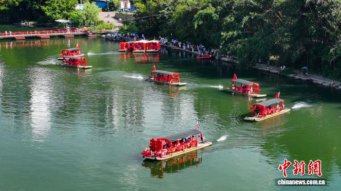 農歷七月初七是中國傳統七夕節。8月30日,在中國最年輕的瑤族自治縣——廣西桂林市恭城瑤族自治縣茶江河上,一場主題為“瑤韻七夕·情定瑤鄉”的水上婚禮上演。當天,一支身著瑤族盛裝服飾的迎親隊伍,抬著花轎、挑著嫁妝,在熱鬧的嗩吶鑼鼓聲中,走過街巷,登上張燈結彩的喜船沿江而下,進行水上婚禮巡游展示。