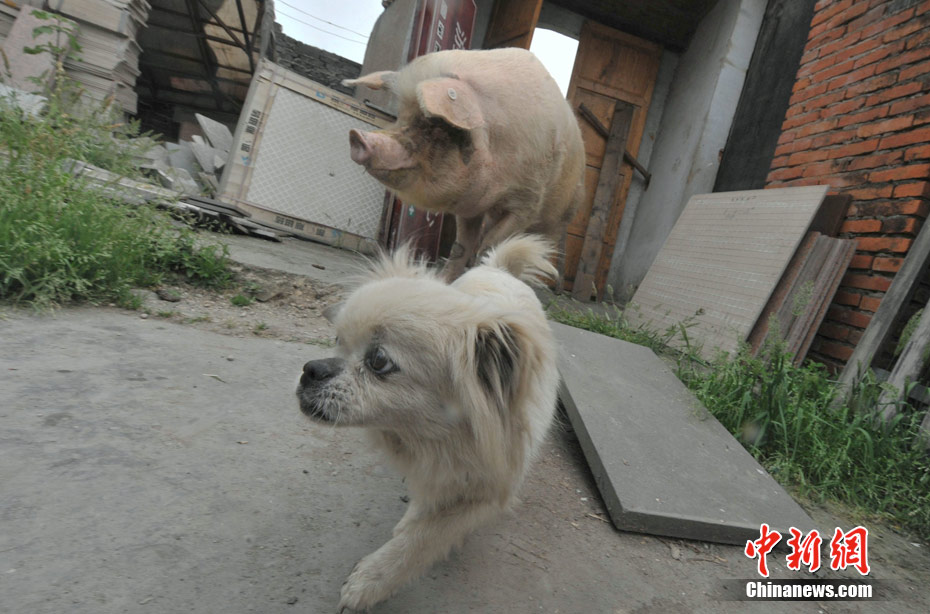 5月8日,四川省大邑建川博物館護養(yǎng)的“5.12汶川大地震”著名抗震動物豬堅強,目前為腿部后遺傷病動過手術(shù)后,正在專設(shè)的動物醫(yī)療所度過休養(yǎng)半年的病假生活之中。圖為豬堅強和小狗作伴。(賈國榮 攝)