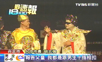 胡志強在臺上對扮演皇帝的郝龍斌說:“報告父皇,我都是跟男生十指相扣,跟你一樣,你也專門跟男人十指相扣。”扮演妹妹的陳文茜也在旁邊起哄,一起調侃郝龍斌日前和馬英九十指緊扣的牽手畫面。被搞笑攻擊的郝龍斌顯然招架不住,還一度接不上臺詞。(陳佳慧)