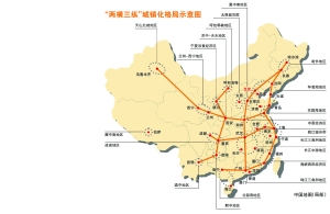 藍圖:在城鎮化建設展開若干年后,我國形成了以陸橋通道、沿長江通道為橫軸,以沿海、京哈京廣、包昆通道為縱軸的“兩橫三縱”發展格局,20多個重點開發的城市群在“兩橫三縱”的坐標軸上聚集,而城市群又發揮著帶動和輻射作用,大城市的發展帶動起中小城市的發展。