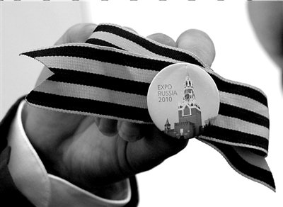徐亞楠除了接待游客,給他們的世博護(hù)照蓋紀(jì)念戳,還給每位游客帶來一個(gè)驚喜:一條別致的紀(jì)念衛(wèi)國(guó)戰(zhàn)爭(zhēng)勝利的“圣喬治”絲帶。這種橙色與黑色條紋相間的絲帶,在俄羅斯象征著勝利,是戰(zhàn)場(chǎng)上戰(zhàn)士英勇精神的標(biāo)志。