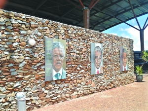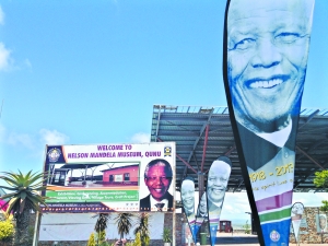 15日,在曼德拉故鄉古努村,媒體區入口處的紀念墻上掛著曼德拉頭像。 (本報記者邢磊攝)