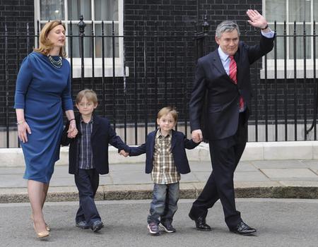 布朗的兩個兒子約翰和弗雷澤也首次與父母一同出現在媒體面前。布朗在宣布完自己的決定后跟家人一起乘車前往白金漢宮向女王正式遞交辭呈。有目擊者稱布朗一家已經開始收在拾行李,有貨車出現首相府的后街。