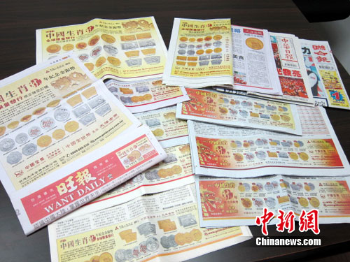 中華錢幣文化是中國(guó)文化的一個(gè)組成部分,生肖文化更為中華民族所獨(dú)有,龍年春節(jié)將至,圖為臺(tái)灣大洋金幣公司在臺(tái)灣《聯(lián)合報(bào)》、《旺報(bào)》、《中華日?qǐng)?bào)》等報(bào)刊推介中國(guó)人民銀行發(fā)行的壬辰龍年生肖金銀紀(jì)念幣。