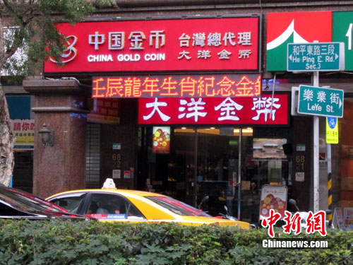 圖為中國(guó)金幣總公司在臺(tái)灣的總經(jīng)銷,位于臺(tái)北市和平東路三段68號(hào)的臺(tái)灣大洋金幣公司正在推介中國(guó)人民銀行發(fā)行的壬辰龍年生肖金銀紀(jì)念幣。