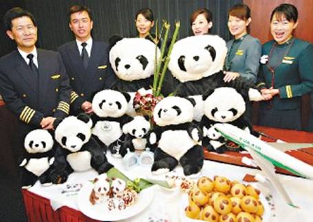在專機客艙的內(nèi)裝飾上特別以可愛的貓熊形象布置客艙環(huán)境,機上餐點及禮品等也別出心裁地以大熊貓為主題,顯示頗具巧思的設(shè)計,“貓熊餅干”、“貓熊面包”等,機上餐點的命名,都在其中巧妙地融合了“團(tuán)團(tuán)圓圓”的名字,如“團(tuán)團(tuán)一品獅子頭”、“圓圓瓜蓉蒸鮮魚”、“團(tuán)圓如意己丑牛”等;在餐點擺盤上,更搭配竹葉或貓熊圖騰做為裝飾,連牛排上也烙印了貓熊的圖案,讓旅客充份感受到貓熊的魅力。