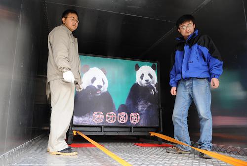 12月21日,工作人員在裝飾運(yùn)送“團(tuán)團(tuán)”“圓圓”的卡車。當(dāng)日,運(yùn)送贈(zèng)臺(tái)大熊貓“團(tuán)團(tuán)”“圓圓”從雅安到成都雙流機(jī)場(chǎng)的工具準(zhǔn)備就緒,卡車和鐵籠均用“團(tuán)團(tuán)”“圓圓”的照片裝飾起來(lái)。新華社記者 陳燮 攝