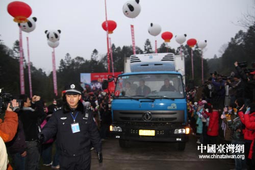 12月23日,四川雅安碧峰峽基地舉行大熊貓赴臺啟動儀式。運載“團團”、“圓圓”的運輸車從碧峰峽基地啟程駛往成都雙流機場。中國臺灣網 田云鵬 攝