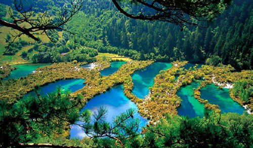 九寨溝海拔在2千米以上,遍布原始森林,溝內分布一百零八個湖泊,有“童話世界”之譽;九寨溝為全國重點風景名勝區,并被列入世界遺產名錄。2007年5月8日,阿壩藏族羌族自治州九寨溝旅游景區經國家旅游局正式批準為國家5A級旅游景區。九寨溝已開樹正、日則、則查洼、扎如4條旅游風景線,長60余公里,景觀分布在樹正、諾日朗、劍巖、長海、扎如、天海六大景區,以三溝一百一十八海為代表,包括五灘十二瀑,十流數十泉等水景為主要景點,與九寨十二峰聯合組成高山河谷自然景觀。四季景色迷人。動植物資源豐富,種類繁多,原始森林遍布,棲息著大熊貓等十多種稀有和珍貴野生動物。遠望高聳云天,加上藏家木樓、晾架經幡、棧橋、磨房、傳統習俗及神話傳說構成的人文景觀,被譽為“美麗的童話世界”。