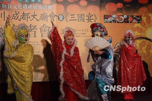 5月20日,來(lái)自四川的演員在臺(tái)北的成都大廟會(huì)記者會(huì)上表演川劇變臉。名列大陸四大廟會(huì)之一的四川成都大廟會(huì),首度跨海來(lái)臺(tái)展示四川最具代表性的非物質(zhì)文化遺產(chǎn),21日將在臺(tái)北登場(chǎng)。中新社發(fā) 羅欽文 攝