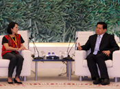 中共中央總書記胡錦濤19日下午在人民大會堂會見了高金素梅率領(lǐng)的臺灣少數(shù)民族代表團(tuán)全體成員,并發(fā)表了即席講話。