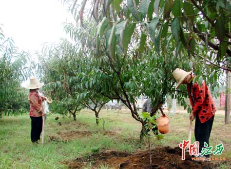 樂安農民正在按照臺灣的技術給果樹施肥。(中國江西新聞網記者記者 王凱 攝)