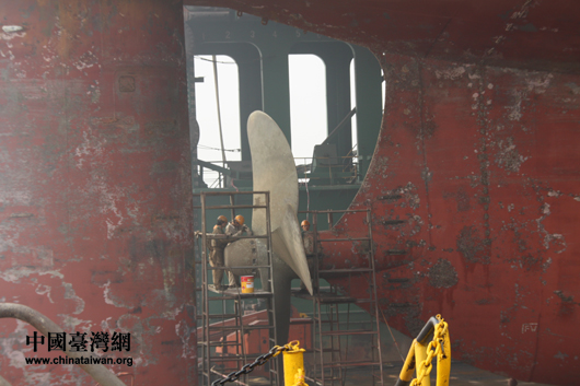正在中遠(yuǎn)川崎維護(hù)的南通號(hào)15萬噸級(jí)巨輪。圖為巨輪螺旋槳部分。 (中國臺(tái)灣網(wǎng) 王偉 攝)