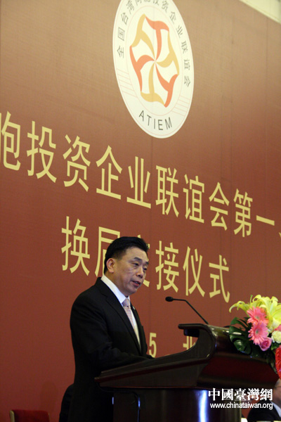 中臺(tái)辦、國(guó)臺(tái)辦主任王毅出席全國(guó)臺(tái)企聯(lián)第二屆會(huì)長(zhǎng)換屆交接儀式,首屆會(huì)長(zhǎng)張漢文(右一)、第二屆會(huì)長(zhǎng)郭山輝(左一)。(中國(guó)臺(tái)灣網(wǎng)發(fā))