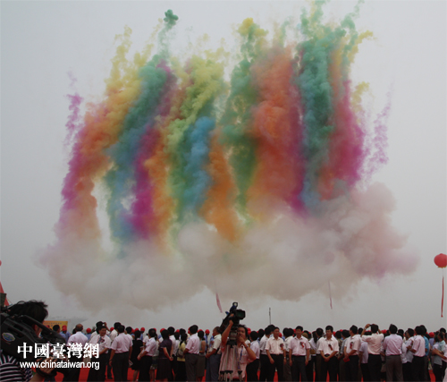 啟動(dòng)儀式結(jié)束后,未散盡的彩色煙霧猶如祥云般升騰在會(huì)場上空,仿佛預(yù)示著在媽祖的庇護(hù)下,津臺(tái)合作即將大展宏圖,兩岸人民的生活永遠(yuǎn)喜樂安康。(記者張蕾) |