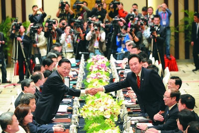 4月26日上午,海峽兩岸關(guān)系協(xié)會會長陳云林(右)與海峽交流基金會董事長江丙坤在南京舉行會談。這是兩會恢復(fù)協(xié)商后領(lǐng)導(dǎo)人第三次會談。新華社記孫參攝