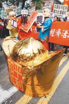 ECFA過關(guān),兩岸和平發(fā)展論壇的支持者以行動劇來表達(dá)“共享和平紅利,擴(kuò)大社會福利”的訴求。圖片來源:臺灣《聯(lián)合報》