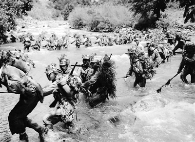 身披偽裝的中國士兵在前往滇西怒江前線的路上,他們將在那里阻截日軍的進犯。