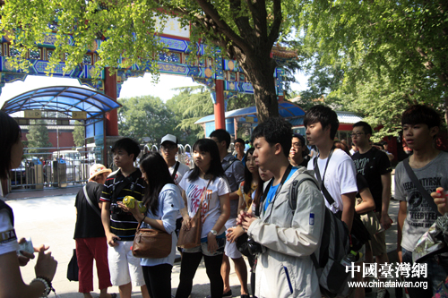 中國(guó)臺(tái)灣網(wǎng)8月10日北京消息 “啊,原來(lái)你們也看康熙哦”,“是啊,在網(wǎng)上就能看到”,“奇怪耶,原來(lái)你們的七用手勢(shì)比是這樣的,我們好不一樣哦”……從娛樂(lè)到生活,從臺(tái)北到北京,同為“90后”,年紀(jì)相仿的兩岸學(xué)子們一見(jiàn)如故,相談甚歡。8月9日當(dāng)天,在大陸志愿者的陪同下,臺(tái)灣青年學(xué)生交流團(tuán)走進(jìn)北京的大街小巷。雍和宮、國(guó)子監(jiān)、南鑼鼓巷、后海,這里的點(diǎn)點(diǎn)滴滴都記錄下了同學(xué)們留戀的背影,見(jiàn)證了兩岸學(xué)子溝通交流的美好時(shí)刻。