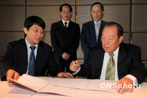 5月20日,在首度訪臺的海峽兩岸農(nóng)業(yè)交流協(xié)會名譽(yù)會長危朝安(后排左)和臺灣二十一世紀(jì)基金會董事長高育仁見證下,雙方代表簽訂2010年合作備忘錄,將在年內(nèi)合作舉辦“第二屆兩岸鄉(xiāng)村座談”等活動,深化兩岸農(nóng)業(yè)、基層農(nóng)民交流。 中新社發(fā) 董會峰 攝