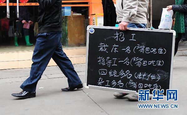 在廣州市制衣行業(yè)最為集中的鷺江村地區(qū),各個(gè)工廠在村里人流較旺的街道“搶人”(2月17日攝)。今年春節(jié)過后,我國華南地區(qū)“用工荒”的聲音再度出現(xiàn);與往年不同的是,中西部地區(qū)這次也加入了“農(nóng)民工搶奪戰(zhàn)”。 新華社記者 盧漢欣 攝