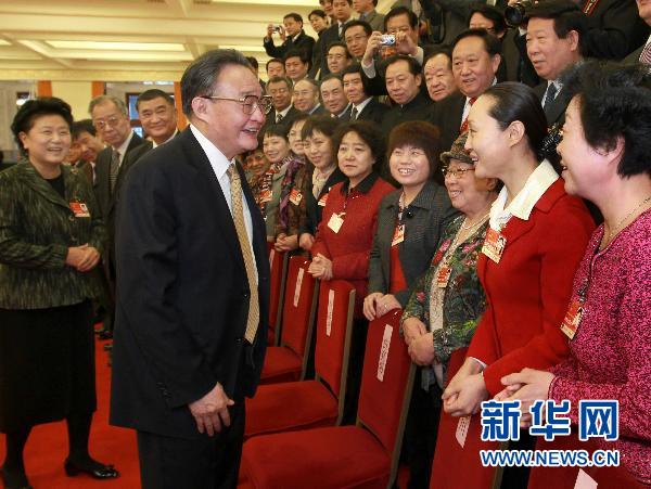 3月8日,中共中央政治局常委、全國人大常委會委員長吳邦國參加十一屆全國人大四次會議河北代表團的審議。這是吳邦國同女代表親切交談,向她們致以節日的祝賀。新華社記者 龐興雷攝