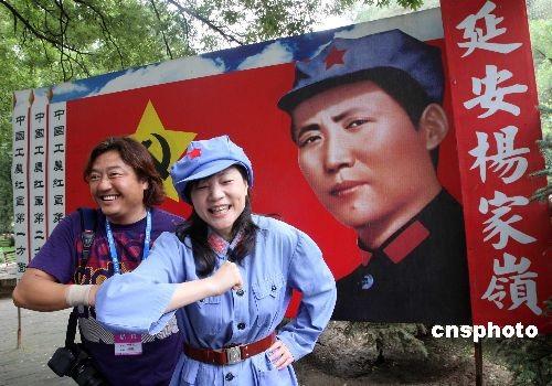 7月20日,參加“情系長安——兩岸文化聯(lián)誼行”的臺灣嘉賓劉盈希(右),在參觀延安楊家?guī)X革命舊址時,饒有興致地穿上當(dāng)年紅軍的服裝擺普士(pose)拍照留念。 中新社發(fā) 張宇 攝