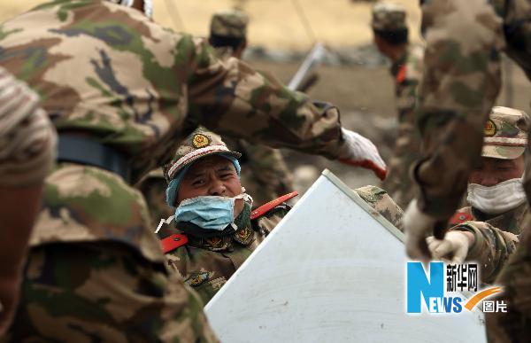 4月22日,武警戰(zhàn)士幫助牧民鐵尕把家中的財物從廢墟中清理出來。新華社記者 費茂華攝