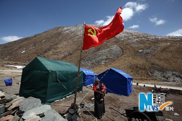 當(dāng)日,記者從青海玉樹縣結(jié)古鎮(zhèn)前往隆寶鎮(zhèn)采訪,一路上發(fā)現(xiàn),無論是在路邊的災(zāi)區(qū)群眾安置點還是深山草甸,都能看到飄揚(yáng)的五星紅旗和黨旗,看到解放軍和武警戰(zhàn)士們忙碌的綠色身影,看到政府發(fā)放的藍(lán)色帳篷。在無情的地震過后,在廢墟和藍(lán)天白云之間,紅色、綠色和藍(lán)色總能讓人心頭涌起一股暖流。新華社記者 費茂華攝