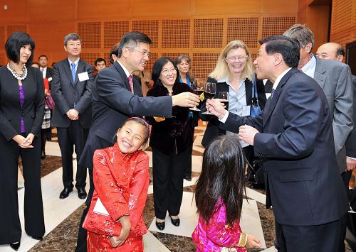 9月28日,在美國(guó)首都華盛頓,中國(guó)駐美國(guó)大使張業(yè)遂(右)在國(guó)慶招待會(huì)上與美國(guó)商務(wù)部長(zhǎng)駱家輝等祝酒。當(dāng)天,中國(guó)駐美國(guó)大使館舉行國(guó)慶招待會(huì),慶祝中華人民共和國(guó)成立61周年,美國(guó)政府官員、駐美外國(guó)使節(jié)和各界友好人士等數(shù)百人出席。新華社記者 張軍 攝