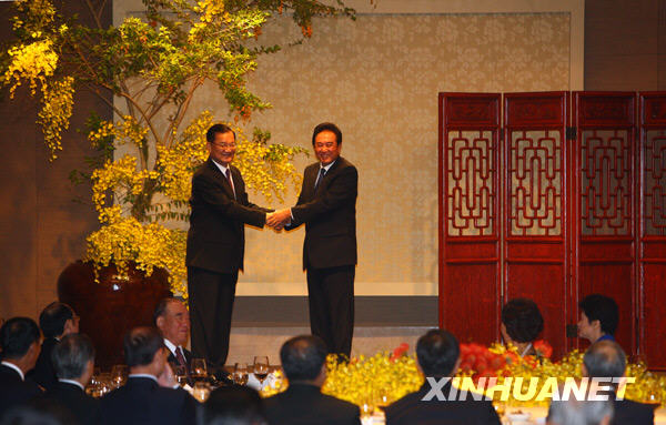 11月4日,連戰(zhàn)與陳云林握手致意。當(dāng)日,中國(guó)國(guó)民黨榮譽(yù)主席連戰(zhàn)在臺(tái)北宴請(qǐng)海協(xié)會(huì)會(huì)長(zhǎng)陳云林一行。新華社記者 邢廣利 攝
