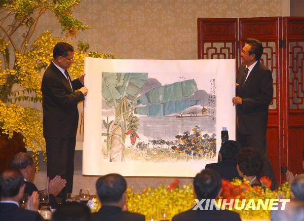 11月4日,連戰(zhàn)向陳云林贈(zèng)送禮物。當(dāng)日,中國(guó)國(guó)民黨榮譽(yù)主席連戰(zhàn)在臺(tái)北宴請(qǐng)海協(xié)會(huì)會(huì)長(zhǎng)陳云林一行。 新華社記者 邢廣利 攝