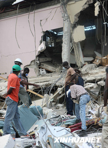 1月16日,在海地首都太子港市區內,幾名市民準備進入自家倒塌的房屋。新華社記者 袁滿 攝