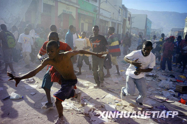 1月17日,在海地首都太子港,搶劫者躲避警方追擊。海地地震發生后,因嚴重缺衣少食,許多不法分子,包括一些饑餓難耐的災民在內,肆意持槍或拿刀搶劫財物。新華社/法新