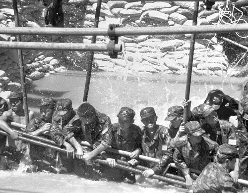 這是解放軍南京軍區(qū)某部紅軍團(tuán)戰(zhàn)士在長(zhǎng)江大堤決口處用人堤堵住決口(資料照片)。新華社發(fā)