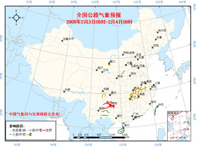 新華網消息 中央氣象臺: 3日08時至4日08時,新疆西南部、西藏西部和東南部的部分地區陰有小到中雪或雨夾雪;四川東南部、云南東北部和南部、貴州西部以及臺灣中東部等地陰有小雨或雨夾雪,其中,貴州西部部分山區有凍雨。東海及其以南海區有5~7級偏北風。