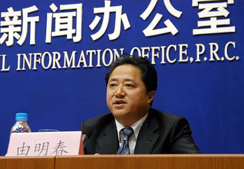 圖為財政部社會保障司副司長由明春回答記者提問。(新華網(wǎng) 陳競超 攝)