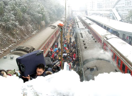 2008年2月1日,湖北宜昌地區雪花漫天飛舞,迎來第四輪大范圍雨雪天氣。在宜昌市火車站里,旅客冒著雨雪踏上返鄉路。 中新社發 劉君鳳 攝