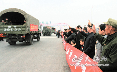 帶著江西人民濃濃感激之情,21日清晨6時起,南京軍區赴贛執行搶險救災任務的1.2萬名官兵踏上回營之路,依依不舍地告別了江西紅土地。