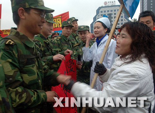 當日,湖南郴州市委、市政府在五嶺廣場舉行歡送儀式,送別來郴州支援抗冰救災的部隊官兵。上萬市民自發來到五嶺廣場送別部隊官兵。當晚6時許,200多名二炮某部官兵離開郴州。 新華社發(李細萬 攝)