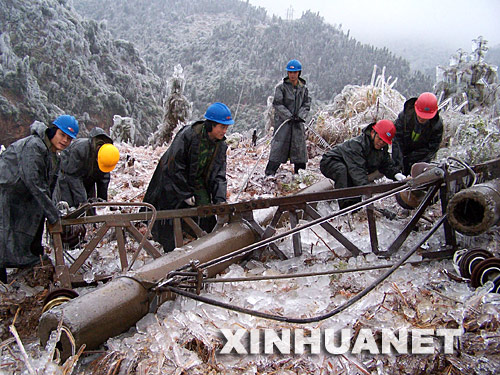 自1月13日以來,廣西昭平縣遭遇持續強冰凍災害襲擊,造成山上大批電力設施和電網被損。災情發生后,該縣300多名電力工人日夜搶修設施和線路,確保全縣生產和生活用電。 新華社發(喻湘泉 攝)