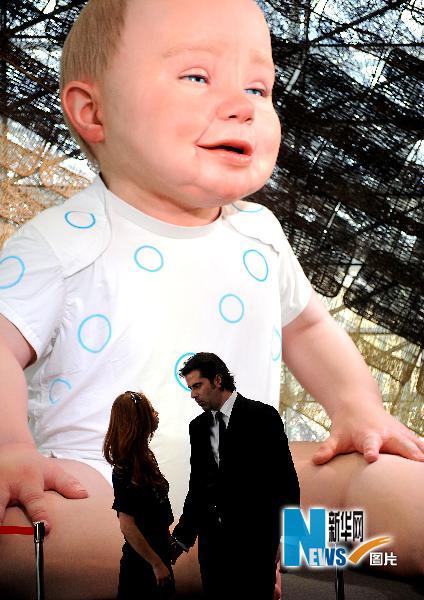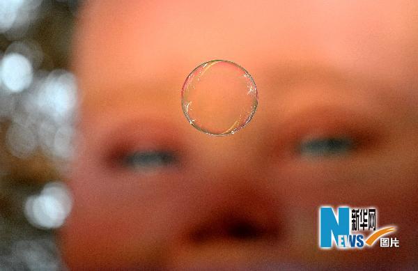 5月1日,在上海世博園西班牙館,坐高6.5米的“西班牙國家館的孩子”--吉祥物“米格林”注視著飄在空中的肥皂泡。新華社記者吳曉凌攝