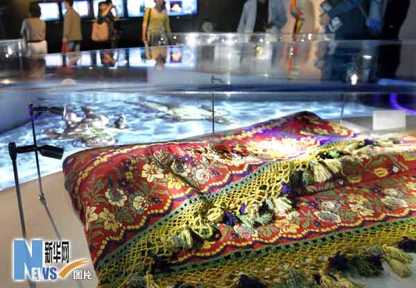意大利館內展示的手工印染的阿拉貢毛毯(5月15日攝)。當日,上海世博會意大利館啟動為期兩周的“卡拉布里亞地區(qū)展”,展示這一地區(qū)的商業(yè)氛圍、多元文化和悠久歷史。卡拉布里亞是意大利南部的一個大區(qū),面積15080平方公里,人口205萬人。 新華社記者 劉穎 攝