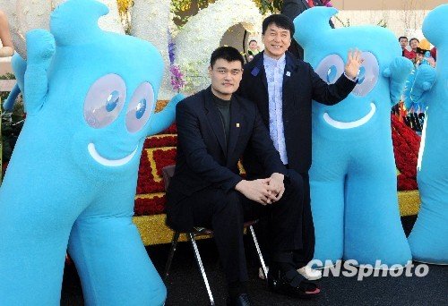 當(dāng)?shù)貢r(shí)間十二月三十一日,剛剛完工的上海世博會(huì)花車接受美國帕薩迪納玫瑰花車委員會(huì)的評審,NBA中國球星姚明和香港影星成龍抵達(dá)現(xiàn)場為上海世博會(huì)花車助陣。 中新社發(fā) 張煒 攝