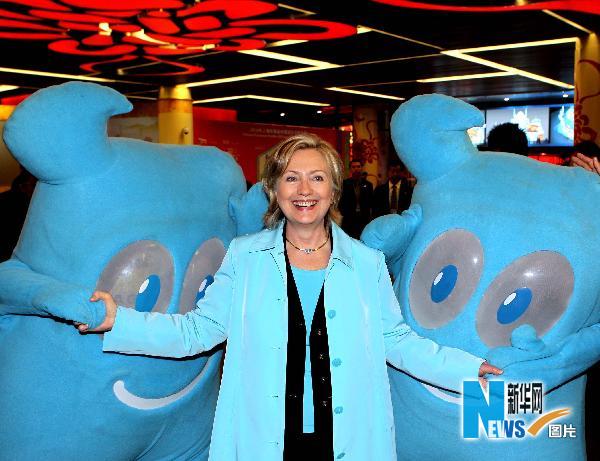 5月22日,美國國務(wù)卿希拉里·克林頓在上海世博園中國館參觀時與“海寶”親密接觸。 新華社記者張明攝