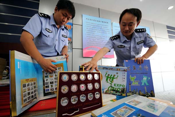 6月28日,民警展示假冒世博會紀念商品。新華社記者 李文 攝