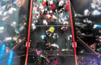昨天(14日)中午,一場暴雨突降園區,澳大利亞館出口處敞開館門讓游客避雨,一旁還有表演為游客解悶。(邵劍平 攝)