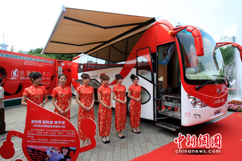 6月2日,中國內(nèi)地首輛房車型愛心獻(xiàn)血車在上海發(fā)車啟用,并將駛?cè)胧啦﹫@區(qū),開展愛心獻(xiàn)血活動。該獻(xiàn)血房車價值500萬元,車內(nèi)寬敞,空氣清新,可營造“快樂獻(xiàn)血”氛圍。中新社發(fā) 潘索菲 攝