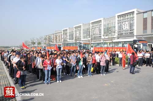 5月25日上午8時18分,在蘇州張家港永聯村的永聯小鎮廣場上,由350名村民職工代表組成的以“放眼看世界,享受新生活”為主題的萬人游世博首發團,登上了開往上海世博園區的旅游大巴。據永聯村黨委書記、永鋼集團董事長吳棟才介紹,此次該村共購買了1.2萬張世博門票,計劃用三個月左右時間,每天分批組織150人左右前往世博園參觀,總投資達400多萬元。