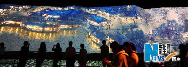 觀眾在中國國家館觀看以現(xiàn)代多媒體技術(shù)演繹的《清明上河圖》夜間景致。新華社記者徐家軍攝 資料圖片